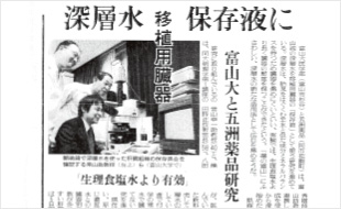 富山大医学部と共同で、富山湾の深層水を移植用臓器の「保存液」として使う研究を進めています。深層水には、80種類を超える様々なミネラルが含まれており、その組成は、胎児を育てる羊水と似ているため、臓器を傷つけずに保存できる可能性があります。