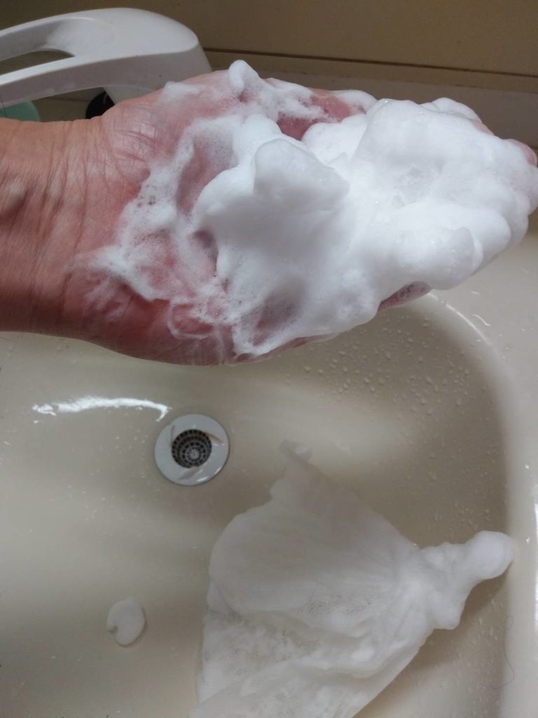 まず洗顔。それまで、私は夜の入浴時にボディソープで顔をゴシゴシ洗うか、朝に顔をぬるま湯でゴシゴシ洗うかでした。妻に洗顔方法を聞いてみたところ「その方法ではダメ」とのことで、指導を受けました。『穂がらか スキンケアソープ』を泡立てネットに入れてぬらしてからネットを軽くこすって泡を作るところから。妻が泡立てるのを見て「こういう風に泡を作るんだ」と感心する私。その泡を妻から受け取り、いよいよ洗顔。いつも通りのやり方で皮脂の汚れを落とそうとしたら、妻より「ゴシゴシするのはダメ! 指の腹でやさしくなでるように」と指導が…。泡が目に入りそうとか、泡で息ができなくなりそうとか、余計なことを考えながらも、泡でやさしく顔をなでるように皮脂の汚れを落としました。泡を洗い流す時も「ゴシゴシ洗うのはダメ」と、妻の指導を受けつつ泡をやさしく洗い流し、顔に残る水滴のふき取りも「タオルでゴシゴシふくのはダメ」とのことで、タオルで顔を覆ってやさしくふき取りました。「ゴシゴシ」はNGということを痛感したわけでして…。洗い上がりは「汚れは落ちたかわからないけど、何かスッキリした」感じで、肌もいつもよりきれいになった感じがしました。